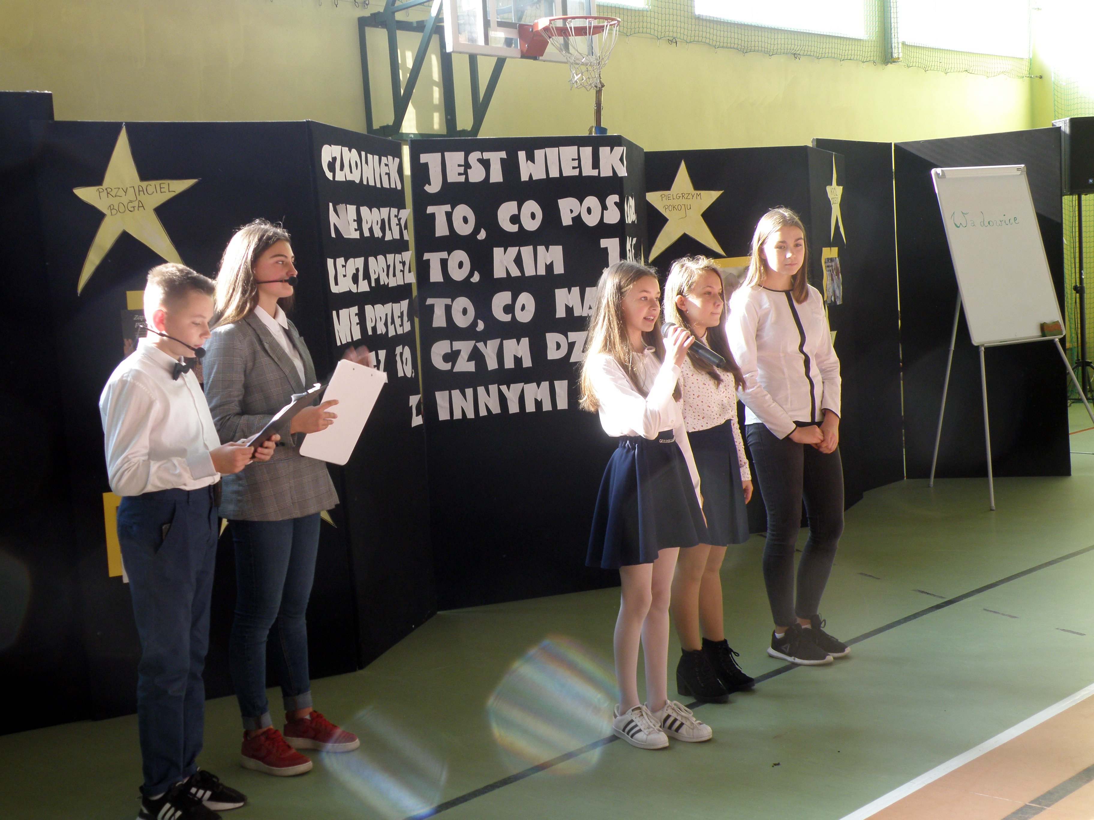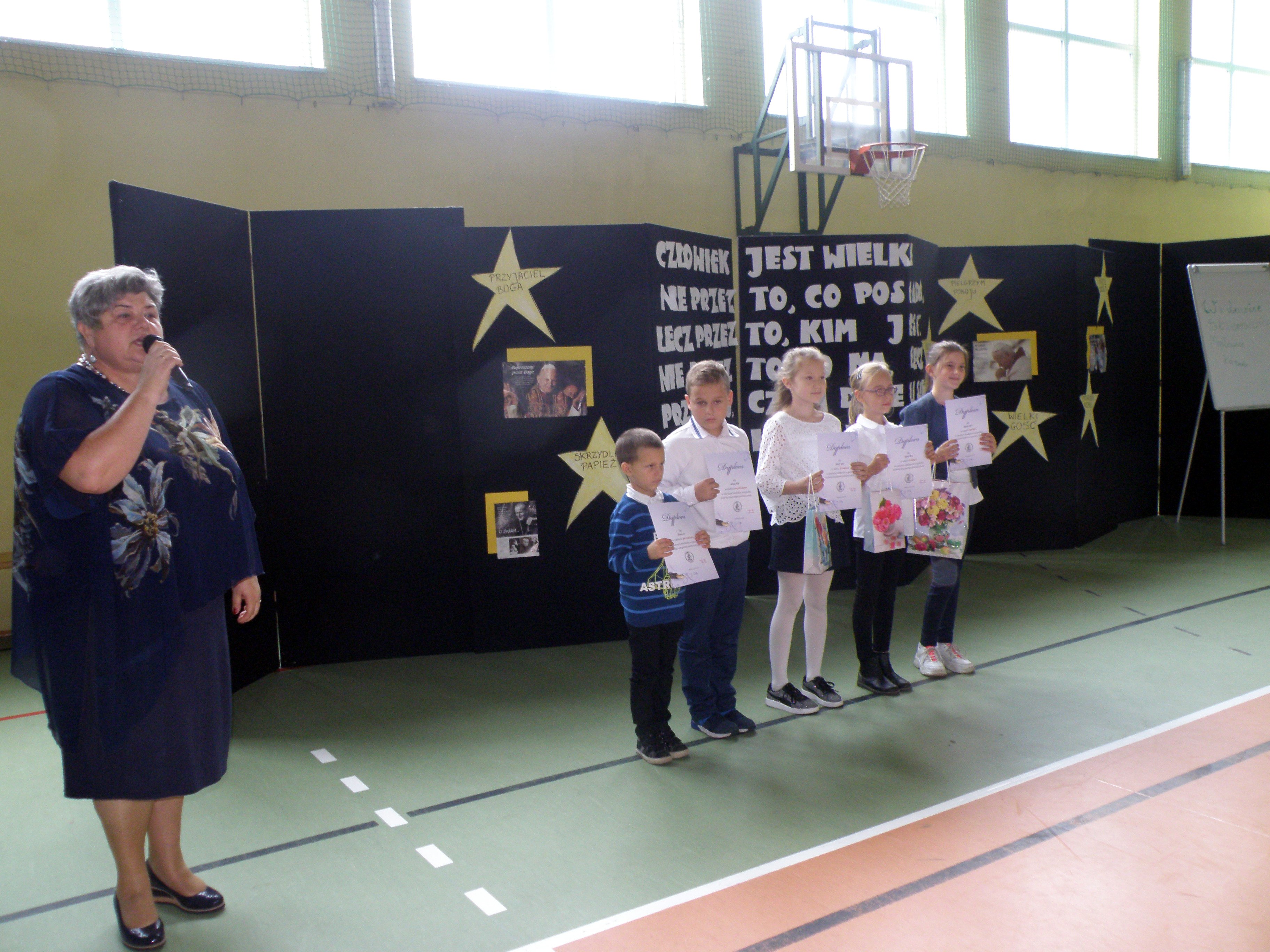 Po występach przedstawiciele samorządu szkolnego złożyli nauczycielom i pracownikom szkoły życzenia z okazji minionego Dnia Edukacji Narodowej. Zostały również wręczone nagrody za konkursy o Janie Pawle II. Najlepsze trzy prace plastyczne, które zyskały uznanie w szkole, zostały wysłane na konkurs ogólnopolski. To prace Szymona Wawszczyka, Szymona Michalskiego i Dominika Seweryna. Nagrodzono też najlepszą gazetkę szkolną o Janie Pawle II wśród klas młodszych. Nagrody wręczyła dyrektorka szkoły Gabriela Laufer.