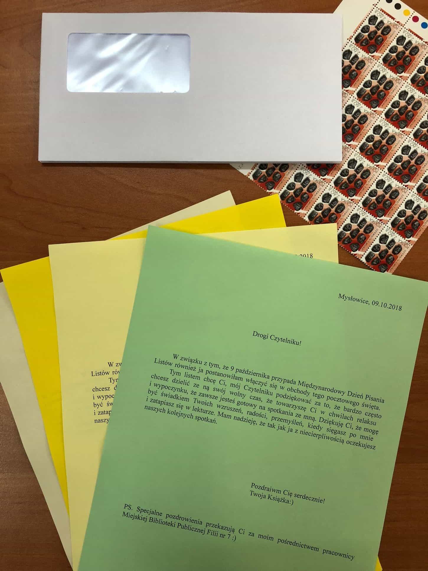 Nadawcą tej nietypowej i sympatycznej korespondencji okazała się książka – mieszkaniec biblioteki. Kolejny element akcji stanowi ekspozycja zachęcająca czytelników Filii nr 7 do wypożyczania książek z dziedziny epistolografii, zbiorów listów i korespondencji znanych osób i beletrystyki z listem w tytule.