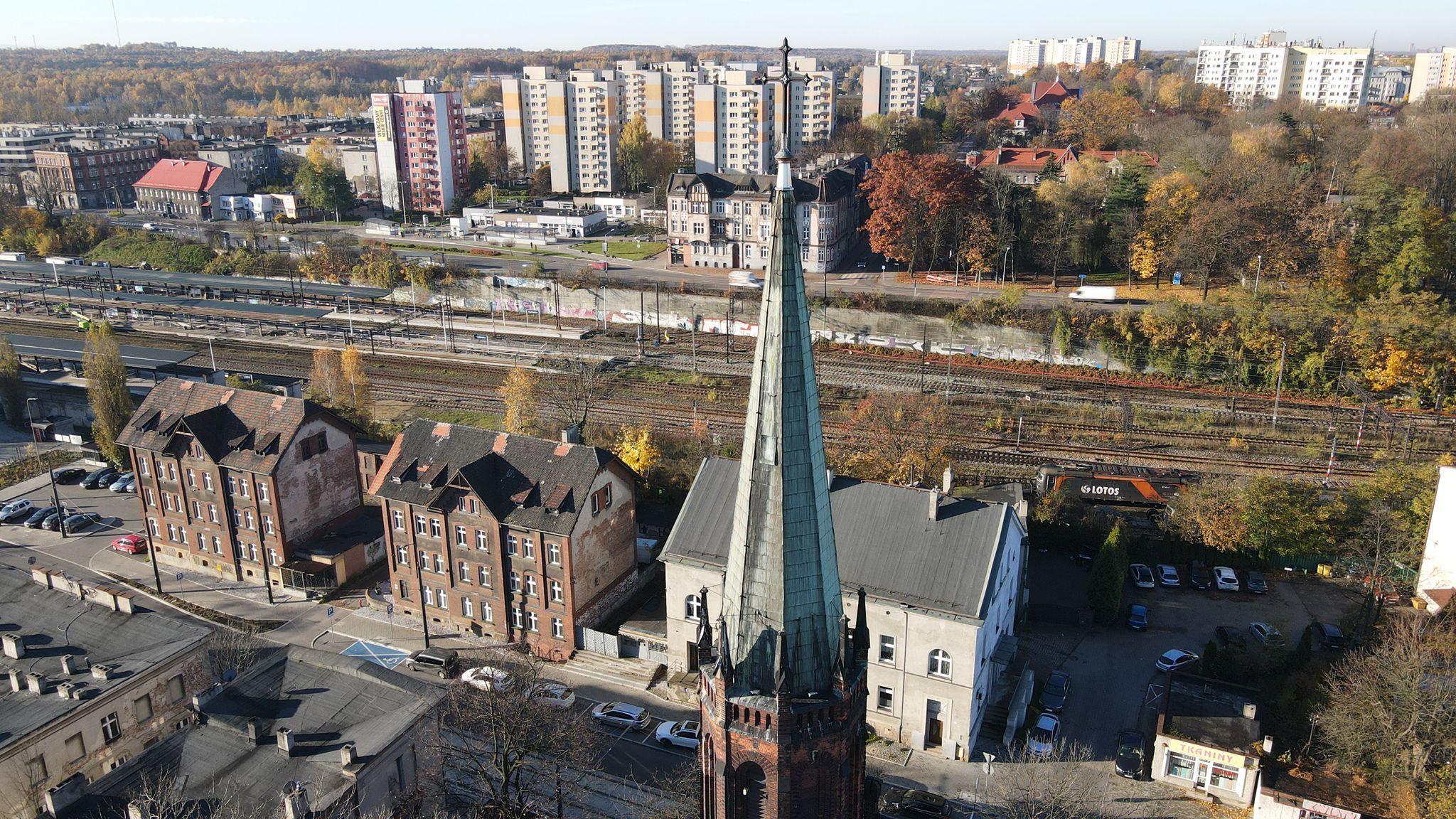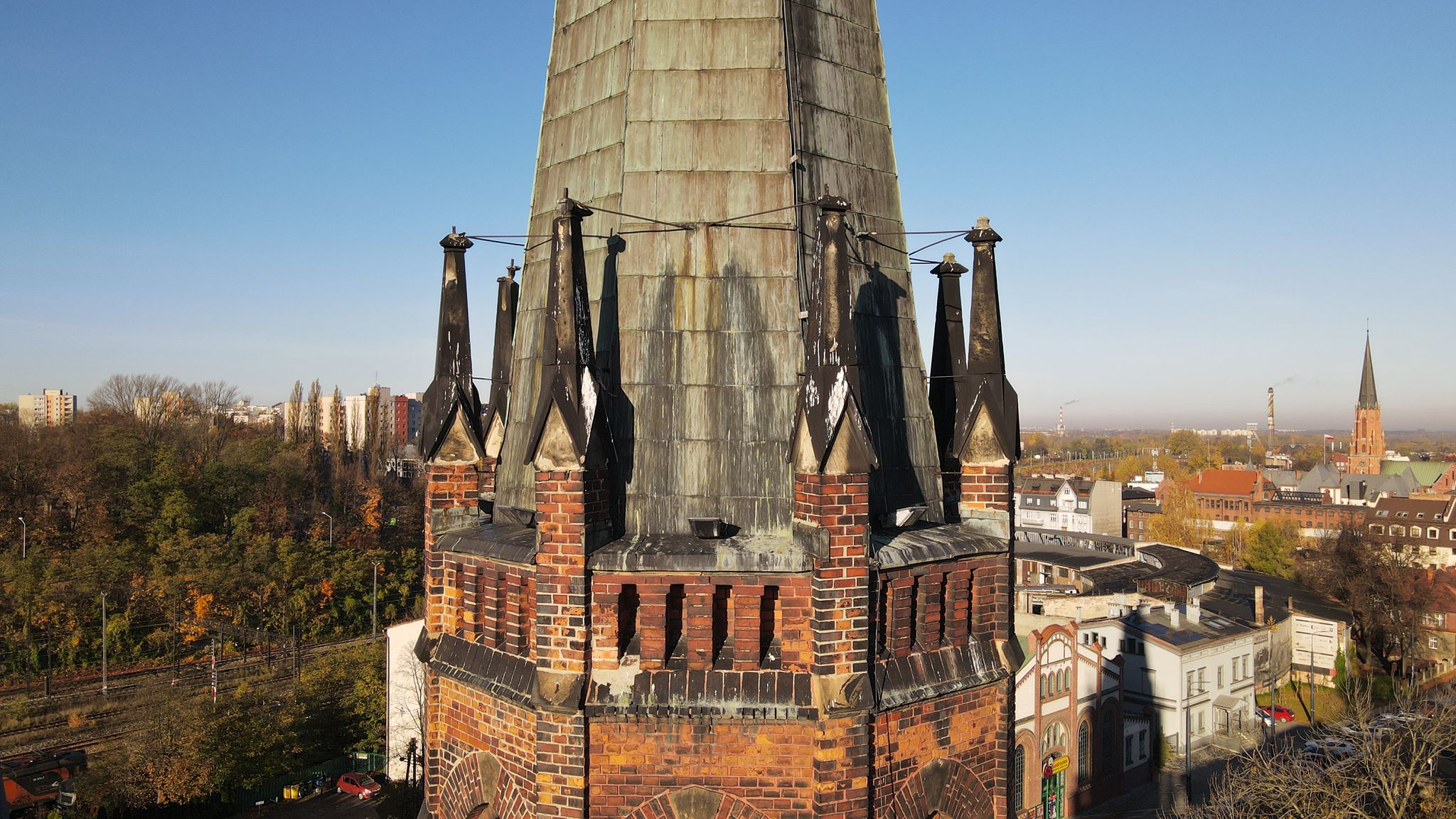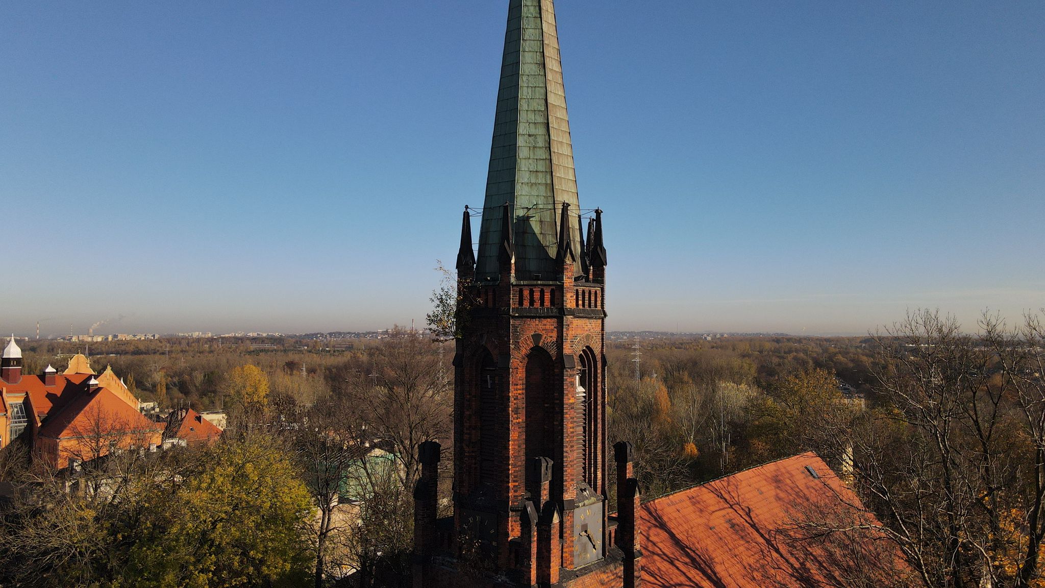 Zobaczcie z lotu ptaka neogotycką wieżę kościoła ewangelicko-augsburskiego Apostołów Piotra i Pawła w Mysłowicach. Przypomnijmy – ten wyjątkowy zabytek, obecny w miejskim krajobrazie od 1877 roku, wymaga pilnego remontu.