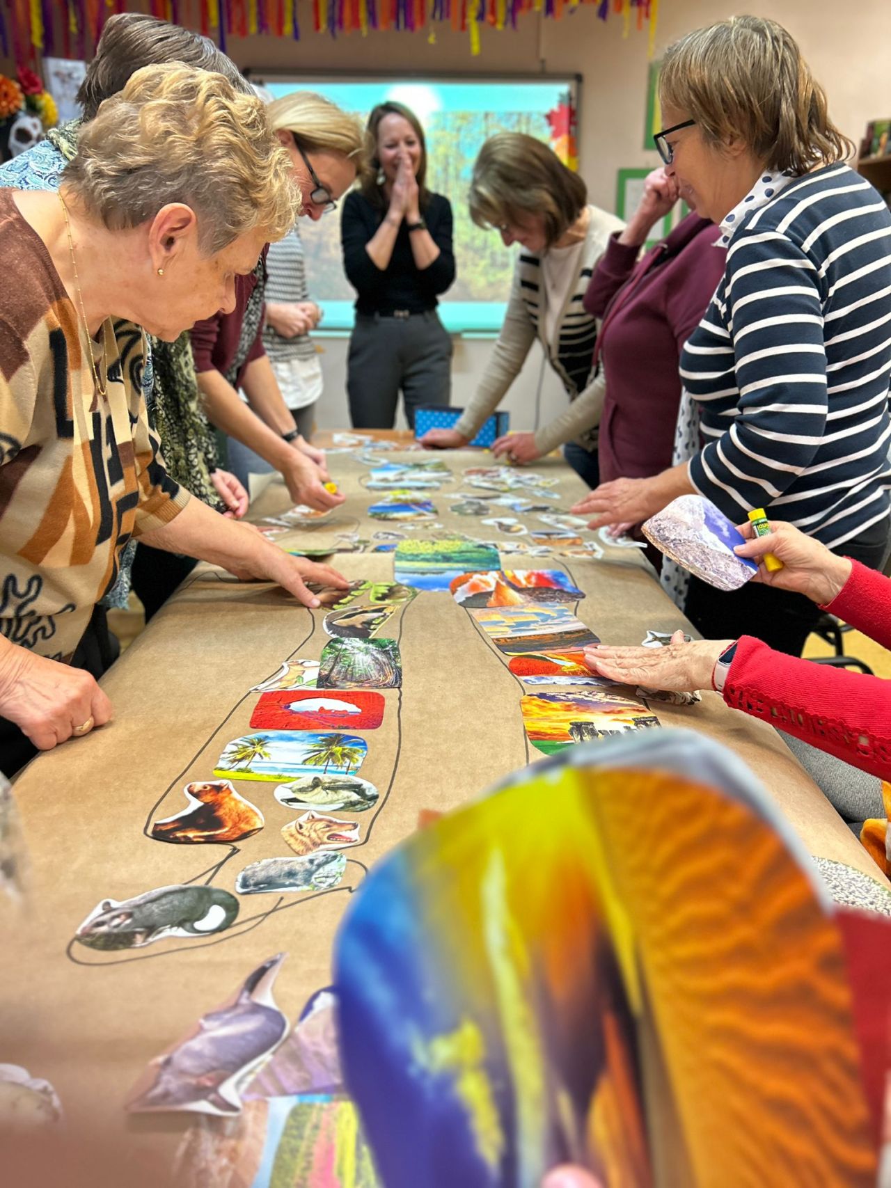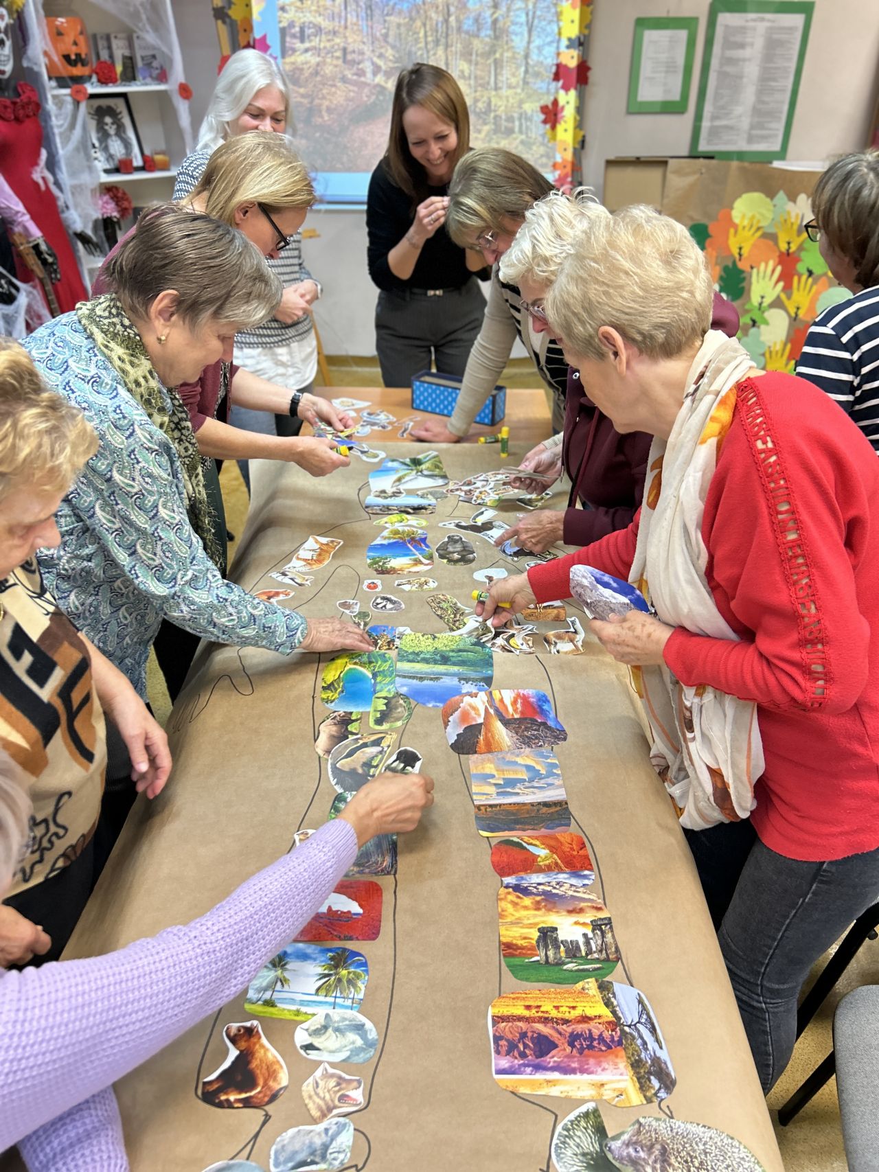 Następne aktywności uczestników spotkania związane były z poszukiwaniem podobieństw człowieka z przyrodą w obrazach czy słowach, zwłaszcza związkach frazeologicznych aż do kolażu, gdzie w obrysowaną postać jednej z seniorek wszyscy wklejali zdjęcia przedstawiające elementy przyrody, od mądrej sowy w głowie, przez motylki w brzuchu, po leśne ścieżki w stopach.