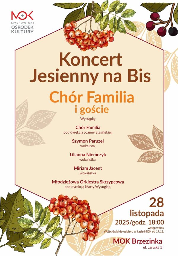 „Koncert Jesienny na Bis” odbędzie się w piątek, 28 listopada o godz. 18 w filii Mysłowickiego Ośrodka Kultury w Brzezince, przy ul Laryskiej 5. Podczas wieczoru chór ponownie wystąpi pod dyrekcją Joanny Stasińskiej, a towarzyszyć mu będzie Młodzieżowa Orkiestra Skrzypcowa prowadzona przez Martę Wysogląd. Gościnnie podczas wydarzenia zaśpiewają również Liliana Niemczyk, Miriam Jacent oraz Szymon Paruzel.