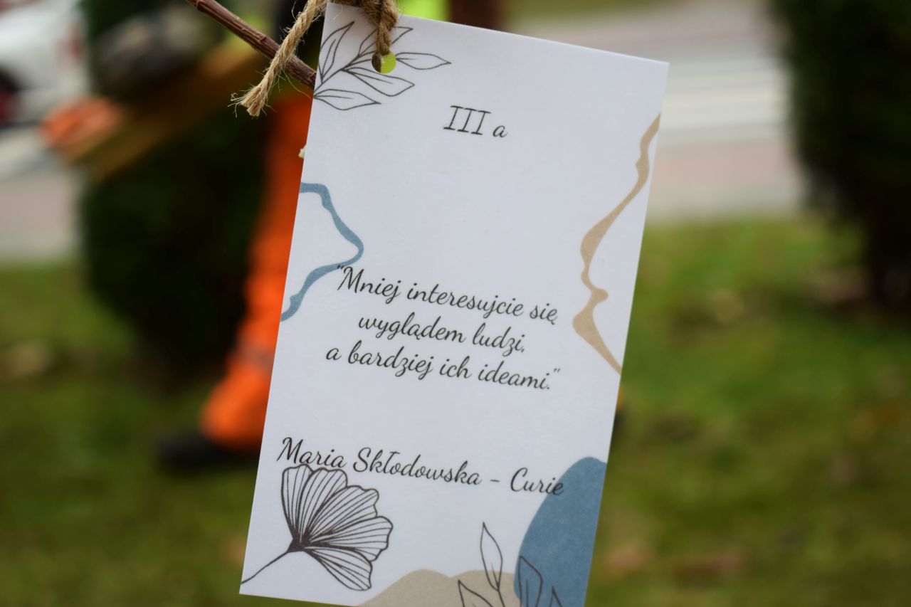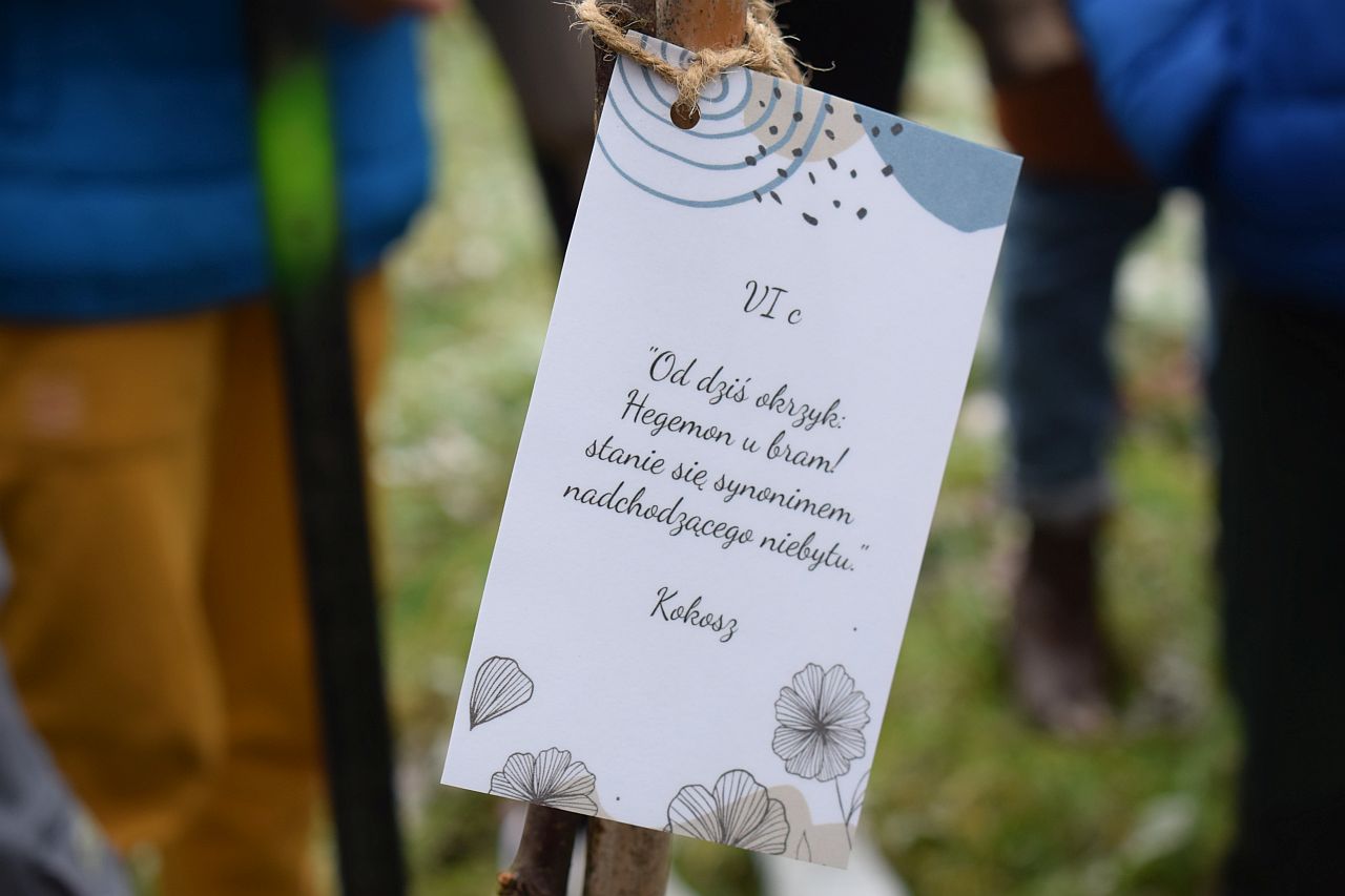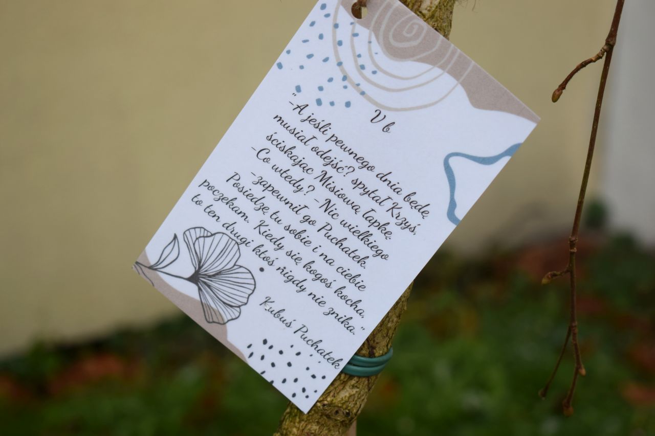 – Każdym z drzew opiekować się będzie inna klasa. Uczniowie przymocowali do nich cytaty ulubionych postaci literackich, ale nie tylko – wyjaśnia Aneta Szczęsny, dyrektorka Szkoły Podstawowej nr 15 z Oddziałami Dwujęzycznymi im. Alfreda Szklarskiego w Mysłowicach.