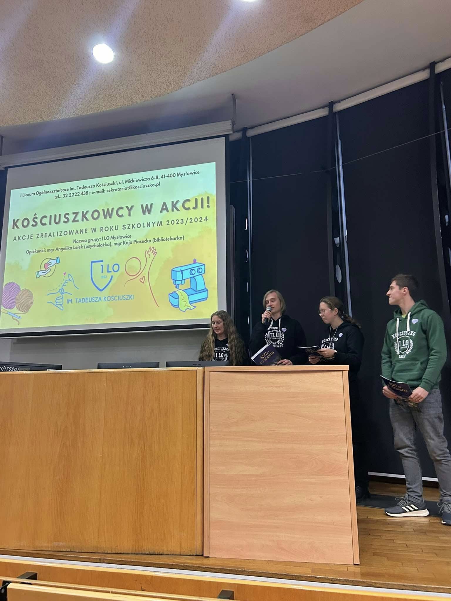 Kościuszkowski wolontariat na scenie reprezentowali uczniowie Anna Palka, Tomasz Natonik, Konrad Pisarzowski oraz Agata Lipka. Reszta przedstawicieli: Marta Kłusak, Julia Wołoszyn, Julia Tuszyńska, Hanna Szymańska, Anna Maruszczyk, pod opieką pani profesor Angeliki Lelek, wspierała ich z widowni.