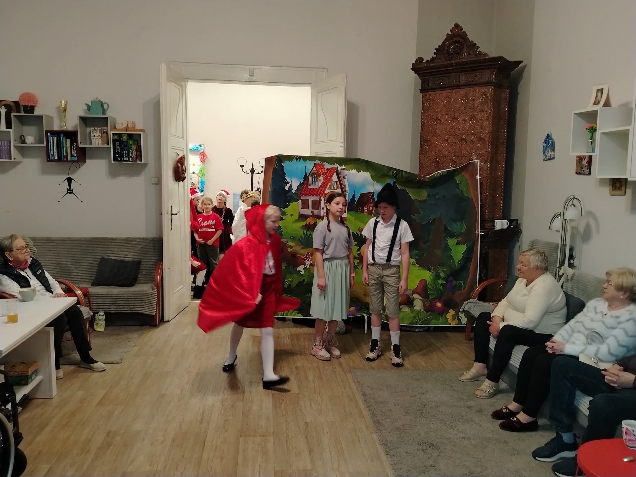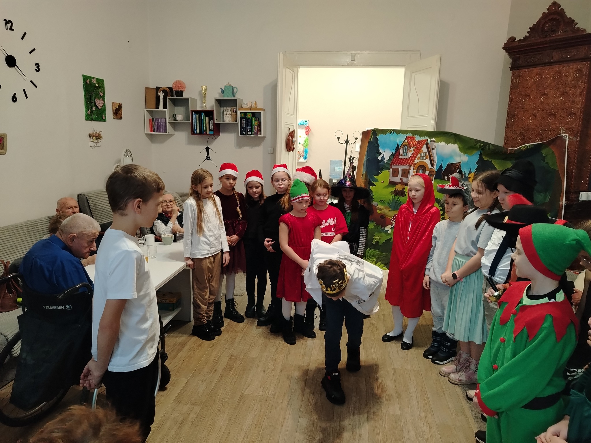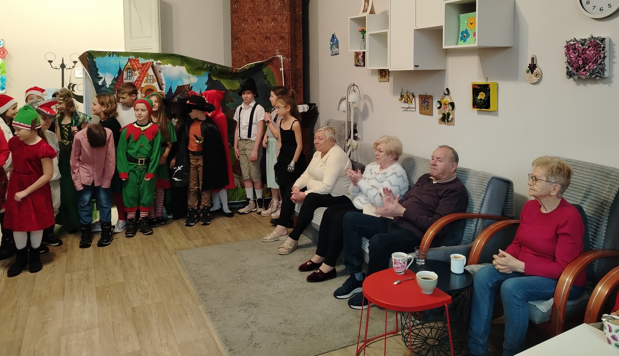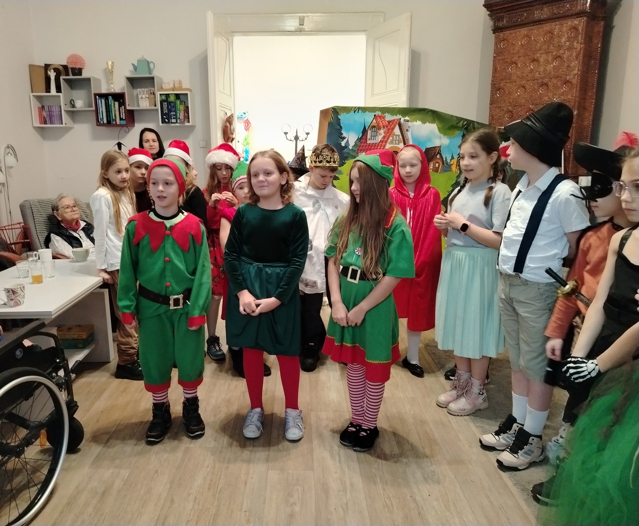 Klasy 3a i 3b Szkoły Podstawowej nr 9 w Mysłowicach, wraz z nauczycielkami Anną Nygą i Sonią Stuchlik, przygotowały występ, w którym prym wiodły postacie z ulubionych bajek, od Jasia i Małgosi, przez Czerwonego Kapturka, aż po złe wiedźmy, Babę Jagę i króla Baj. Dzieci wystąpiły w kolorowych kostiumach i zaśpiewały piosenki, które zachwyciły pensjonariuszy, za co ci nagrodzili młodych aktorów gromkimi brawami.
