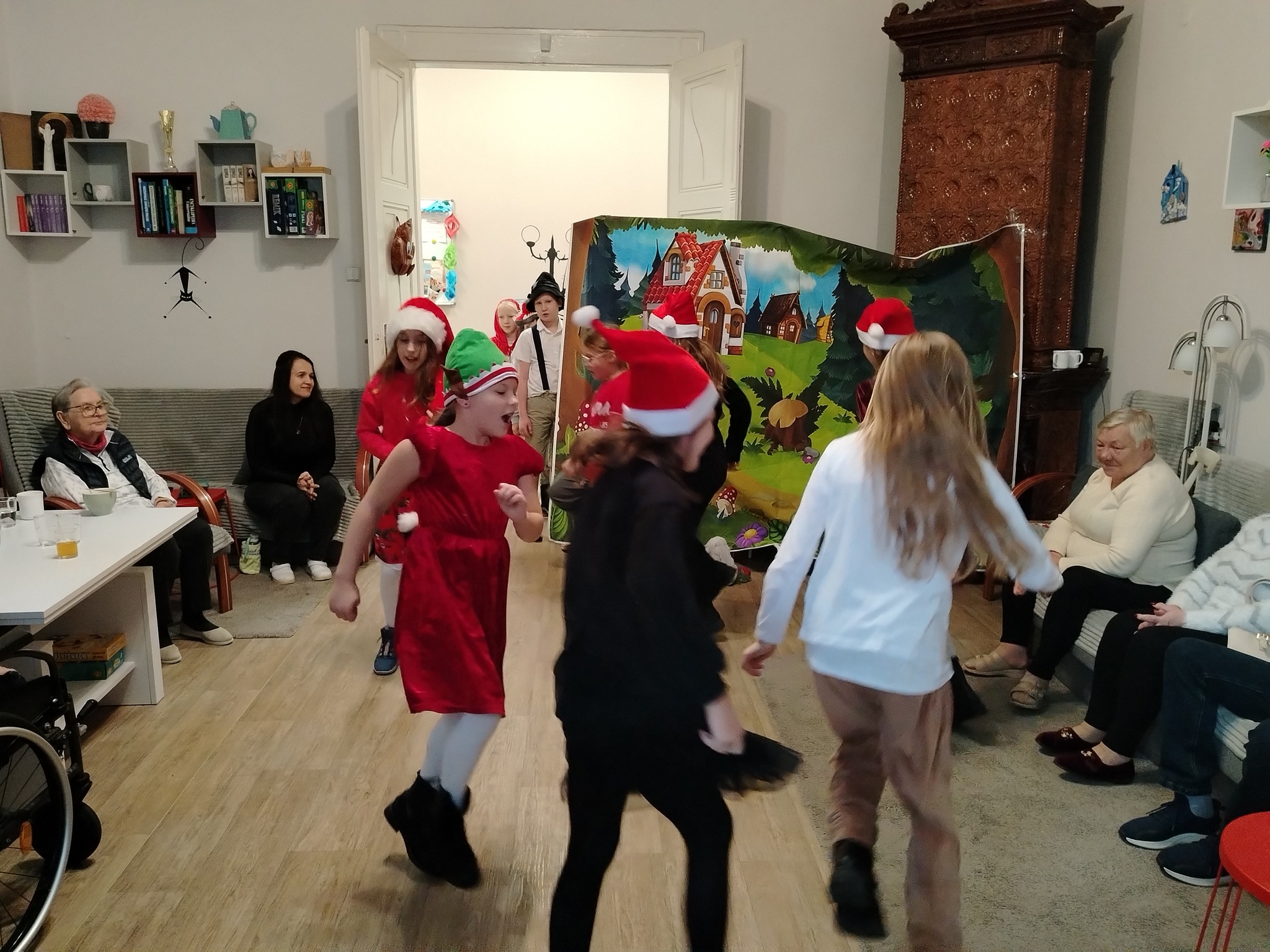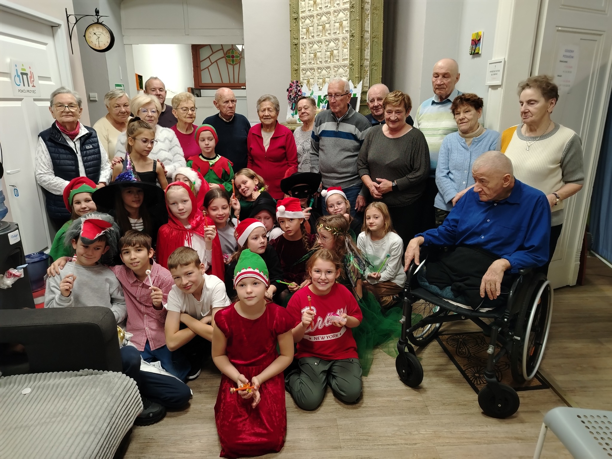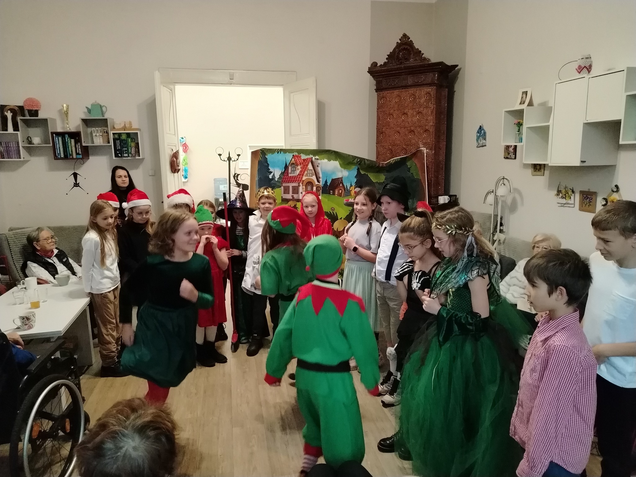 Klasy 3a i 3b Szkoły Podstawowej nr 9 w Mysłowicach, wraz z nauczycielkami Anną Nygą i Sonią Stuchlik, przygotowały występ, w którym prym wiodły postacie z ulubionych bajek, od Jasia i Małgosi, przez Czerwonego Kapturka, aż po złe wiedźmy, Babę Jagę i króla Baj. Dzieci wystąpiły w kolorowych kostiumach i zaśpiewały piosenki, które zachwyciły pensjonariuszy, za co ci nagrodzili młodych aktorów gromkimi brawami.