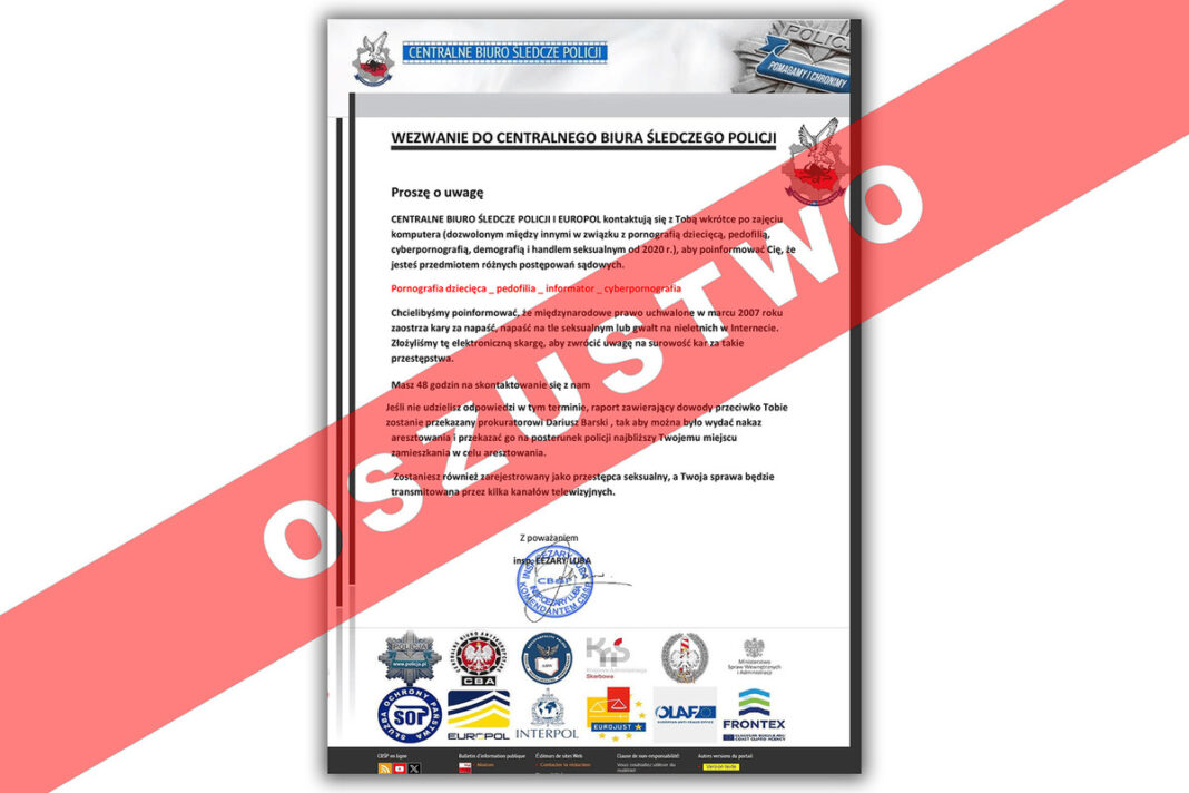 „Przestępcy informują o rzekomym „zajęciu komputera” przez służby, w związku z wykrytą m.in. pornografią dziecięcą. Straszą także, że osoba zostanie zarejestrowana jako przestępca seksualny i »sprawa będzie transmitowana przez kilka kanałów telewizyjnych«” – informuje policja.