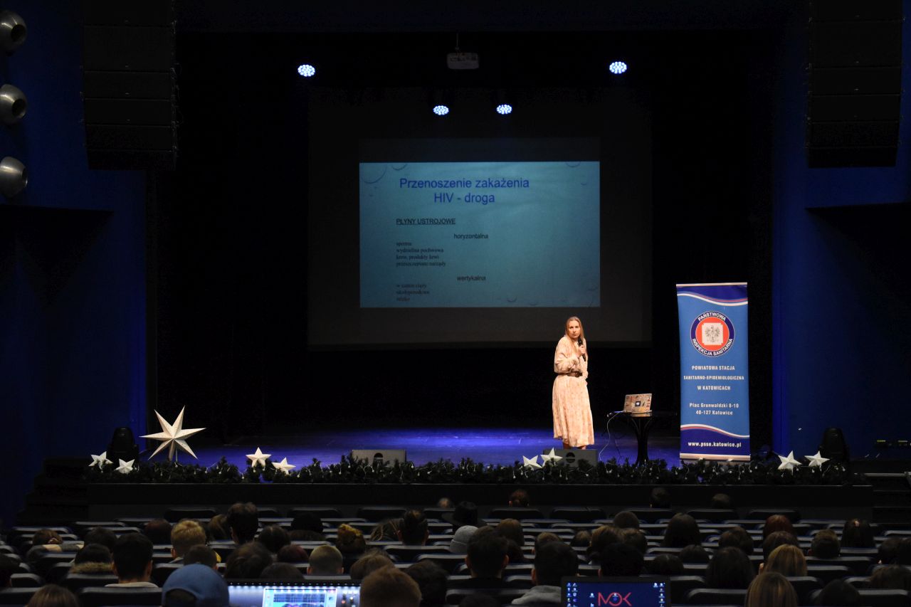Prelekcję o godz. 12:00 poprowadziła psycholożka Iwona Hildebrandt, która przekonywała, że HIV i AIDS to tematy, które mogą dotyczyć każdego z nas, bo wiek naszej aktywności seksualnej ciągle się przesuwa.