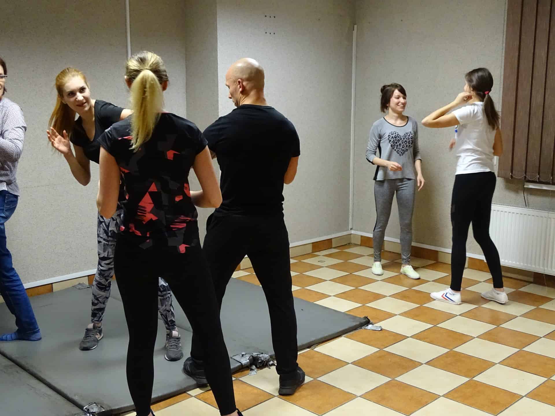 Na początku instruktor mł. insp. Sebastian Stachoń omówił techniczne szczegóły zajęć i opowiedział o psychologicznym aspekcie samoobrony, odpowiedział również na szereg pytań naszych gości.