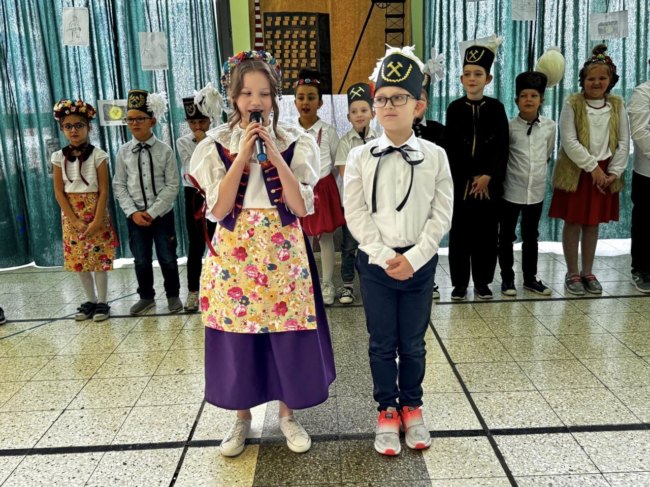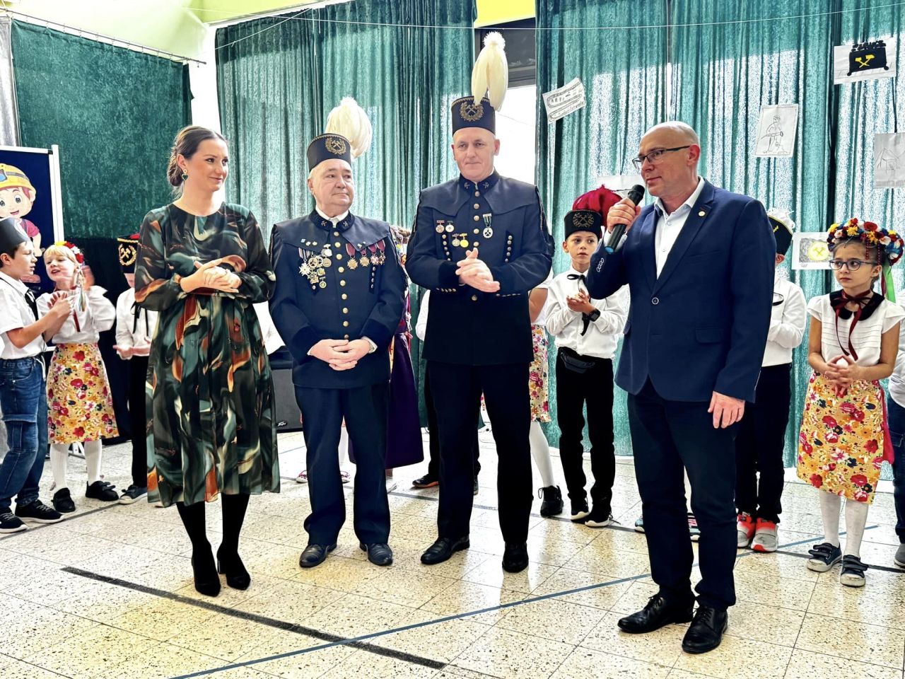 Po uroczystym przywitaniu „trocha po ślonsku, a trocha po polskiemu” uczniowie wprowadzili gości w nastrój „Górniczego walczyka”.