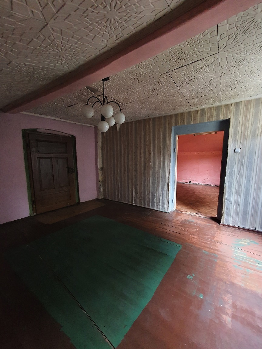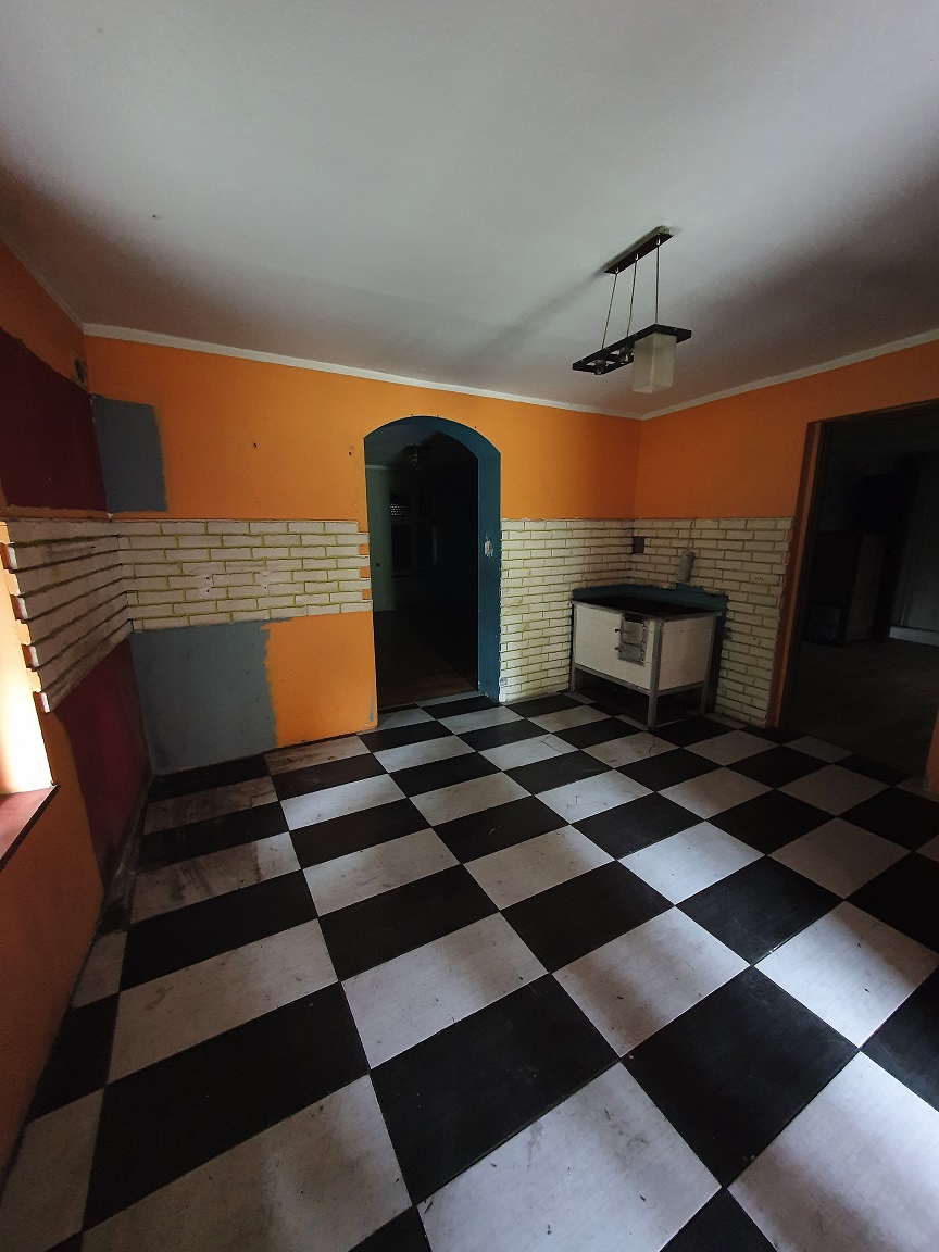 „Zbywana nieruchomość jest w części zabudowana budynkiem mieszkalnym, parterowym, z poddaszem, podpiwniczonym, wykonanym w technologii tradycyjnej murowanej o powierzchni użytkowej 103,07 m2 oraz murowanym budynkiem gospodarczym o powierzchni 7 m2. (…) Stan techniczny budynku mieszkalnego określono jako średni, a standard i funkcjonalność pomieszczeń jako niski. (…) Media: energia elektryczna, wodociąg, kanalizacja – wykonane przyłącza” czytamy w ogłoszeniu.